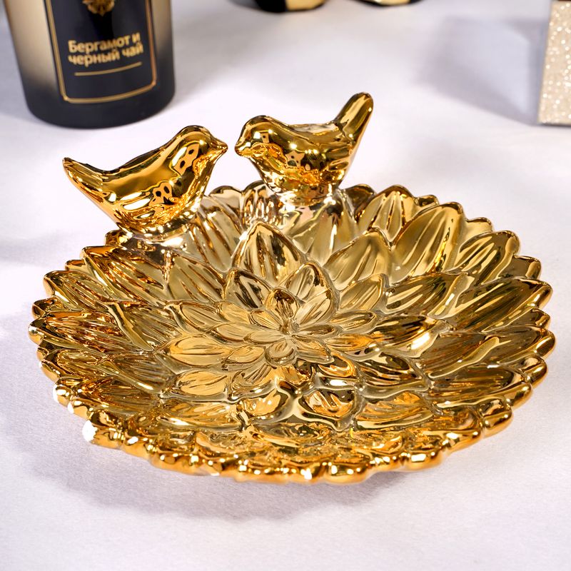 Декоративная тарелка для аксессуаров и ювелирных украшений "Птички" добавит изысканности в Ваш интерьер! Выполнена в форме золотого цветка с 2 птенцами. Состав: керамика. Соберите всю коллекцию "Чёрное золото" и дополните интерьер элегантными деталями!