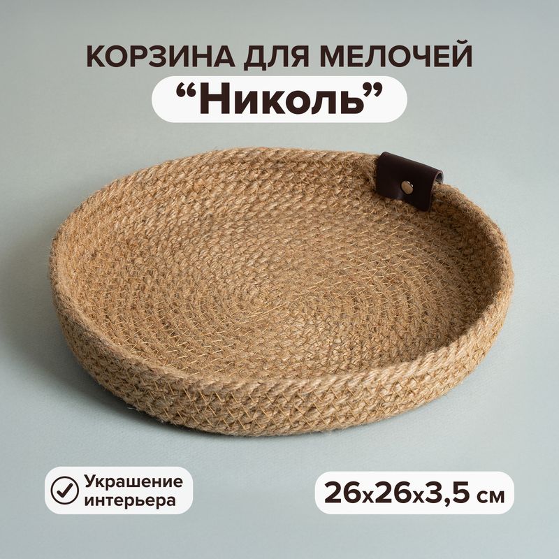Корзина для мелочей "Николь" прекрасно подходит для хранения небольших предметов, а также размещения ароматических саше или диффузора. Размер: 26х26х3,5 см. Состав: джут, полиэстер, полиуретан, сталь.