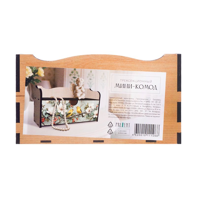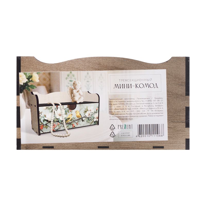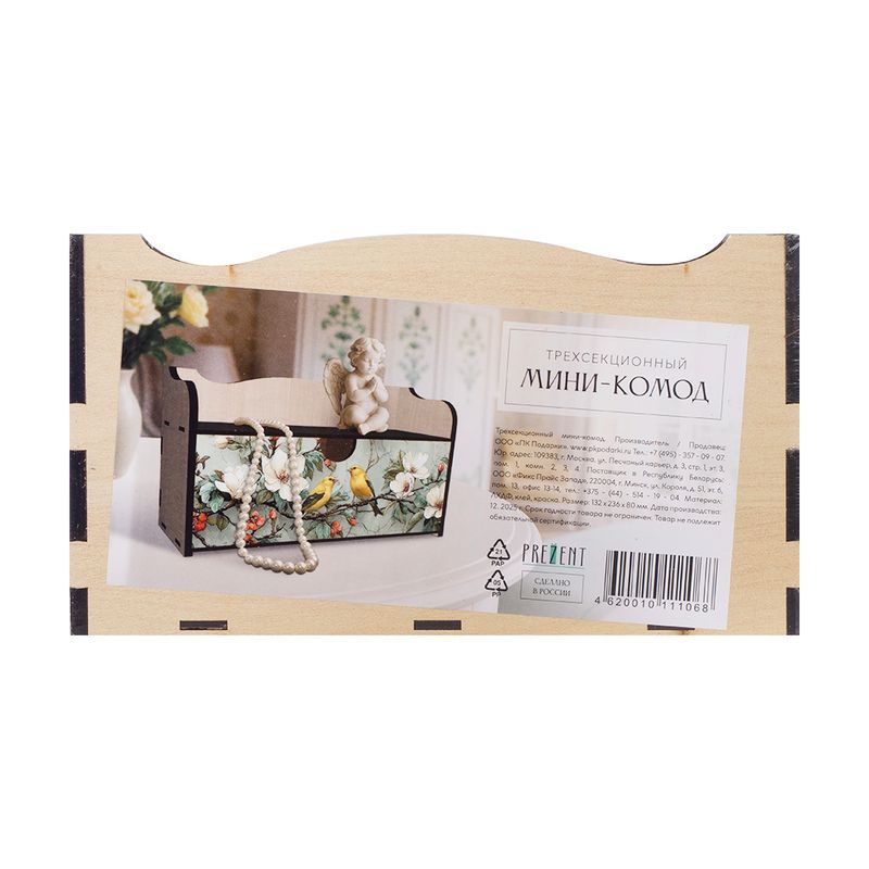 Трёхсекционный мини-комод, PREZENT – практичный и элегантный элемент декора. Отлично подходит для хранения украшений и других мелочей. Украшен изящным изображением. Размер: 136х236х80 мм. Состав: ЛХДФ, клей, краска. Товар представлен в ассортименте.