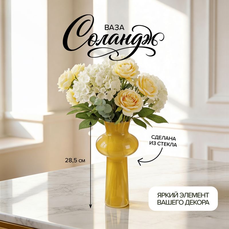 Ваза "Соландж" — эффектный и яркий элемент декора для букетов и интерьерных композиций. Помогает создать уютную атмосферу и подчеркнуть стиль помещения. Высота: 28,5 см. Состав: стекло. Товар представлен в ассортименте.