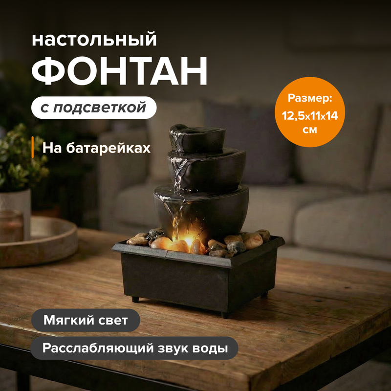 Настольный фонтан с подсветкой поможет создать спокойную и уютную атмосферу в интерьере. Мягкая подсветка и звук воды добавляют ощущение уюта и расслабления. Компактный декоративный элемент подойдёт для размещения на столе, полке или тумбе. Работает от батареек. Размер: 12,5х11х14 см. Состав: полипропилен, силикон, АБС-пластик, сталь, камни. Товар представлен в ассортименте.