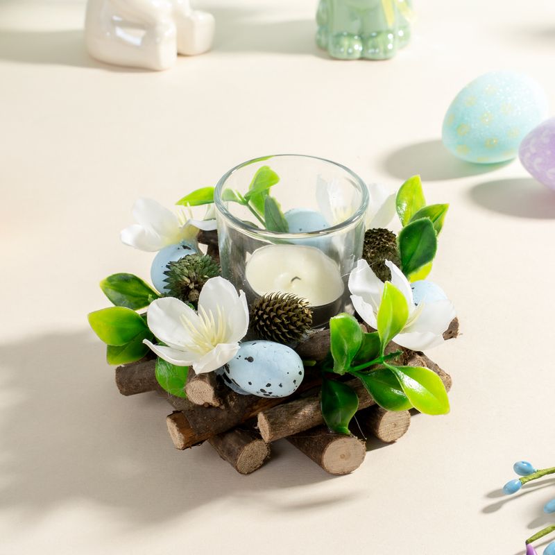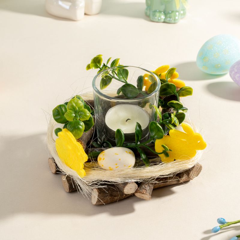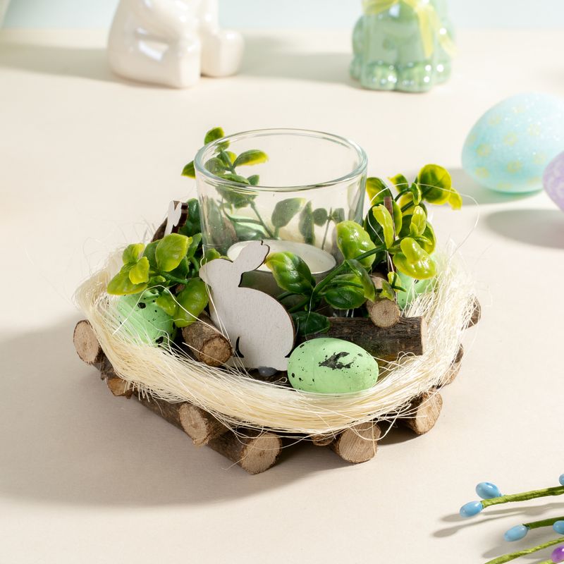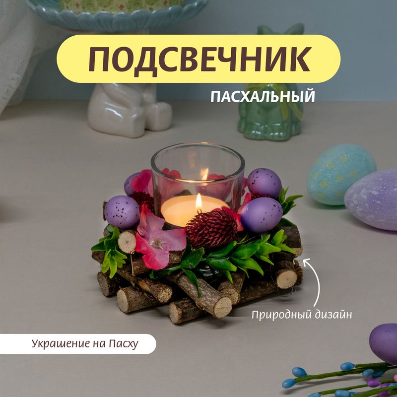 Подсвечник пасхальный, Товары к Пасхе, поможет создать тёплую и уютную атмосферу во время праздника. Состав: стекло, дерево, ПВХ, полиэстер, пенополистирол, сизаль, шишка, МДФ, фетр, сталь.