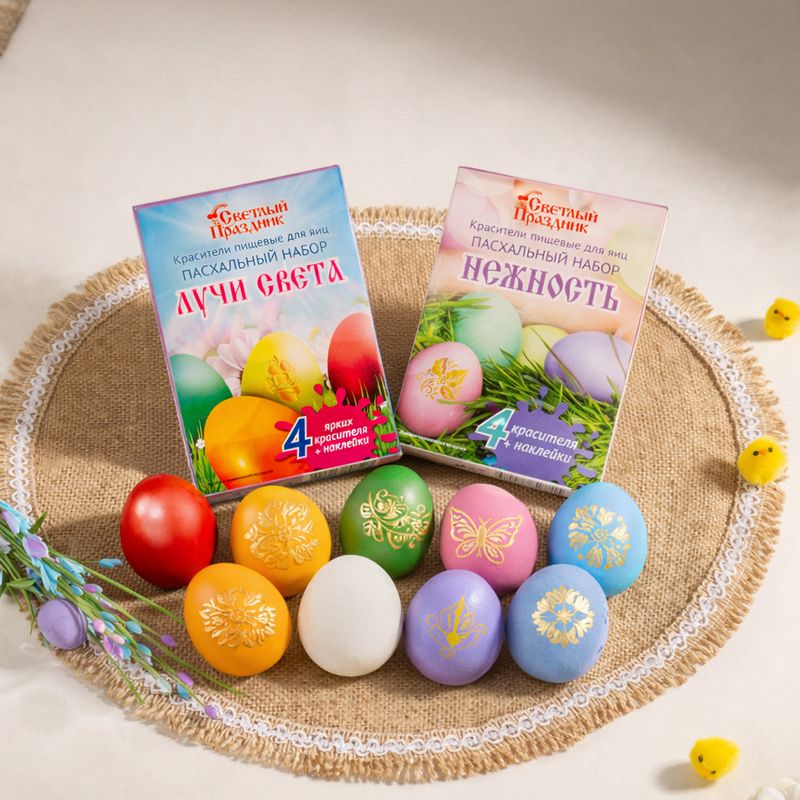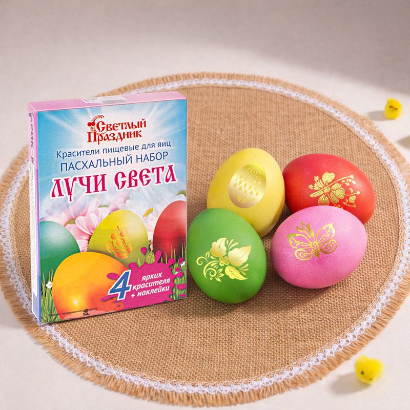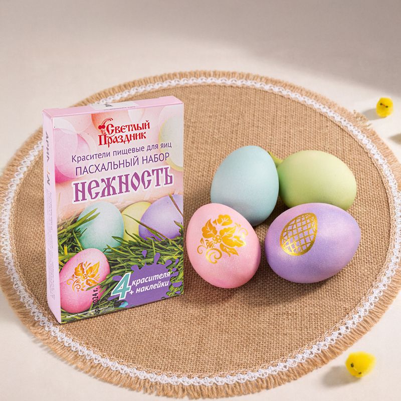 Пасхальный набор "Нежность", Светлый праздник, поможет украсить одно из главных угощений праздника. Перед использованием ознакомьтесь с инструкцией и мерами предосторожности на упаковке. Внутри 4 красителя разных цветов и декоративные наклейки. Товар представлен в ассортименте.