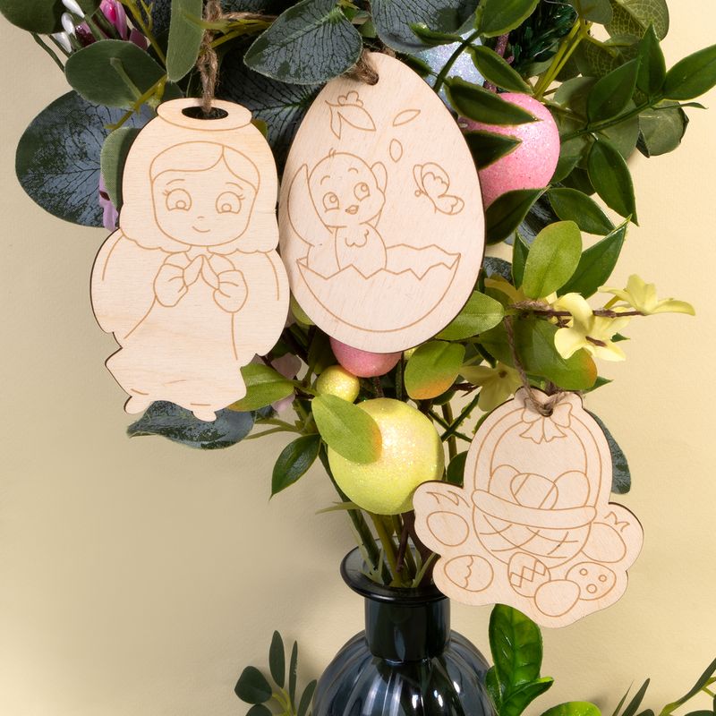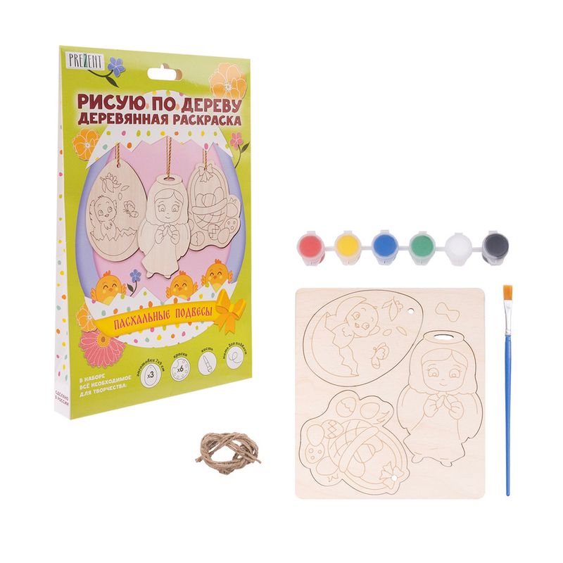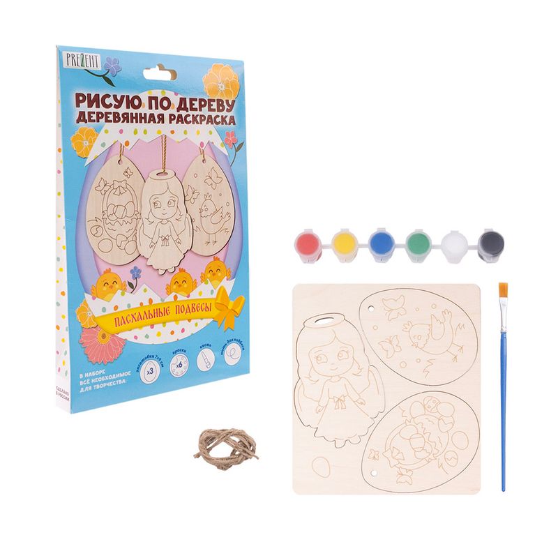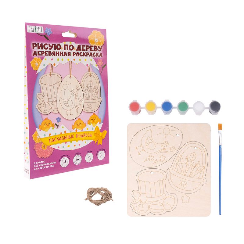 Набор "Деревянная раскраска", поможет сделать своими руками оригинальные деревянные подвесы! Готовые украшения можно повесить на веточки вербы или подарить гостям на Пасху. В набор входят 3 заготовки, 6 цветов для раскрашивания, кисть и верёвочка для подвешивания. Состав: фанера (береза), акриловые краски, джутовый шпагат, кисть. Товар представлен в ассортименте.