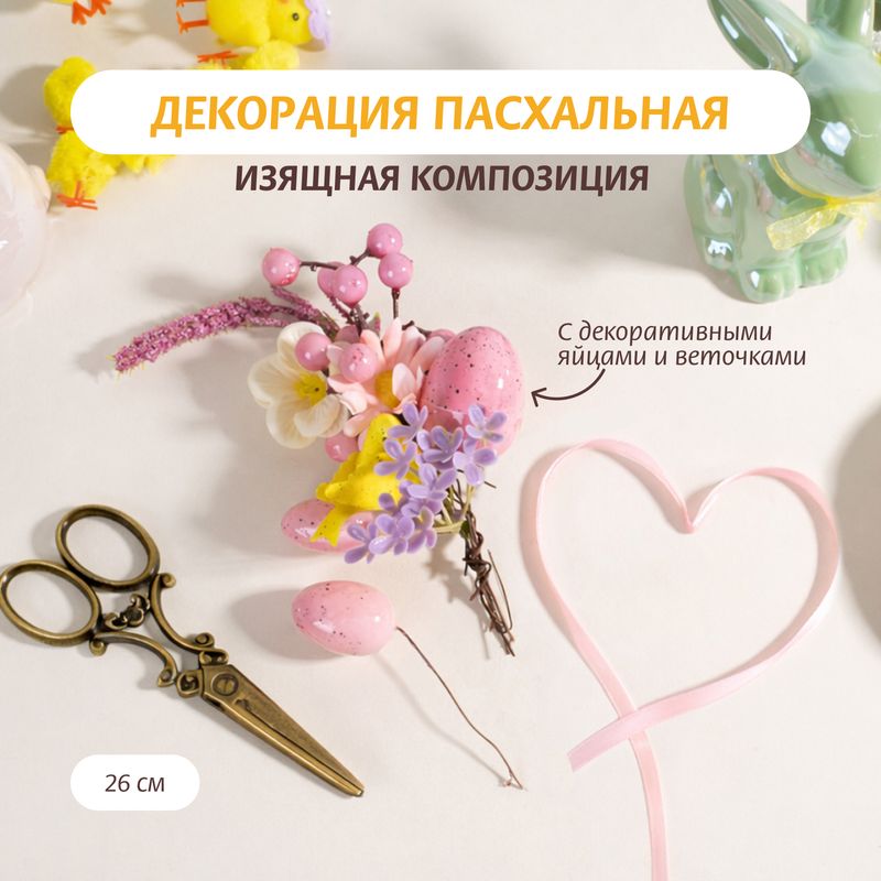 Набор для декорирования пасхальный, Товары к Пасхе, с цветами и фигурками поможет составить оригинальную композицию для украшения праздничных поделок или подарка! Состав: пенополистирол, полиэтилен, бумага, полиэстер, полипропилен, сталь.