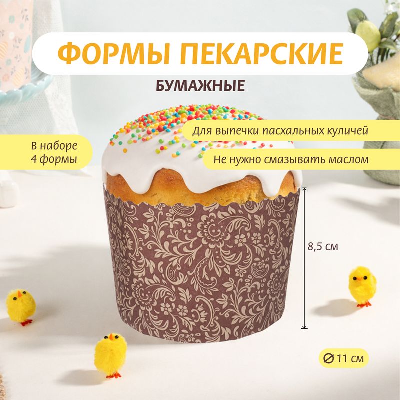 Формы пекарские бумажные, Домашняя кухня, предназначены для расстойки и выпечки пасхальных куличей. Стильное оформление подходит для подачи угощений на праздничный стол. Не требуется смазывать маслом. В наборе 4 формы. Диаметр: 11 см. Высота: 8,5 см.