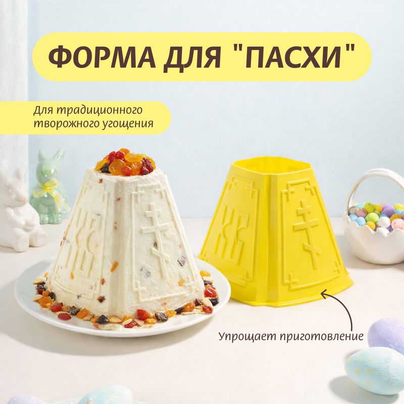 Форма для "Пасхи" предназначена для приготовления традиционного творожного блюда и поможет легко сформировать готовое изделие. Состав: полиэтилен. Товар представлен в ассортименте.